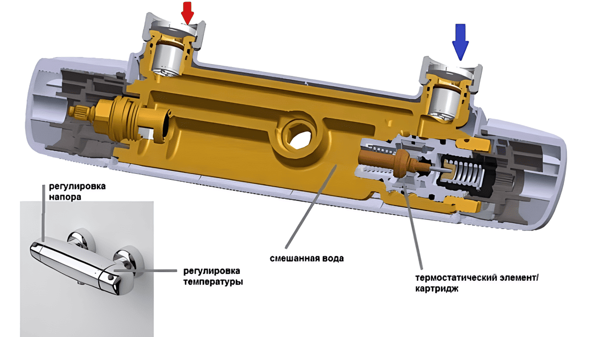 Сам картридж заполняется воском. Эти материалы настолько оперативно реагируют на снижение или повышение градусов воды, что пользователь не замечает изменений и не испытывает дискомфорта. Картридж соединяется с регулировочным винтом, благодаря чему происходит восстановление температуры.