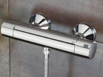 - Термостатические смесители, включающие, помимо обязательных элементов, лейку для душа, слив и переключатель. Изделие может иметь разную форму, чаще всего – трубчатую систему, оканчивающуюся переключателями.
