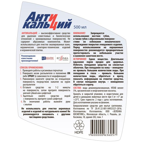 Не использовать для очистки акриловых изделий и изделий из натурального камня! Не рекомендуется смешивать с другими чистящими средствами.ВНИМАНИЕ! Запрещается использование жестких губок, а также губок с абразивными поверхностями во избежание механического повреждения покрытия очищаемого изделия.ОСТОРОЖНО! Едкое вещество. Длительное вдыхание паров вредно для здоровья. Избегать попадания средства на слизистые оболочки. При попадании на кожу – немедленно промыть большим количеством воды. При попадании в глаза – промыть большим количеством воды, обратиться к врачу, показать информацию на этикетке средства. В случае попадания внутрь – немедленно обратиться к врачу.СОСТАВ: вода деминерализованная, НПАВ менее 5%, органические и неорганические кислоты.