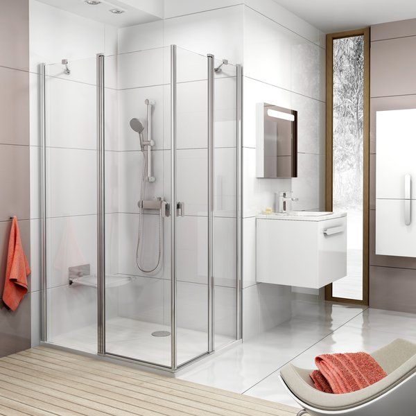 Скомбинируйте разные размеры душевых дверей с неподвижной стенкой и создайте квадратное или прямоугольное душевое пространство.