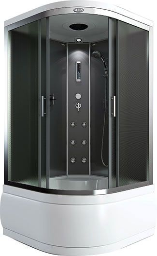 поддон высокий 50см фронтальные стекла матовые фактурные задние стекла матовые «серебро» центральная панель стекло матовое «серебро» хромированный алюминиевый профиль регулируемые ролики хромированные ручки для дверей 4-х режимный смеситель ручная лейка на штанге 6 гидромассажных форсунок верхняя лейка «тропический душ» стеклянная полка пульт управления с функциями: радио, свет, вентилятор излив для набора воды в поддон