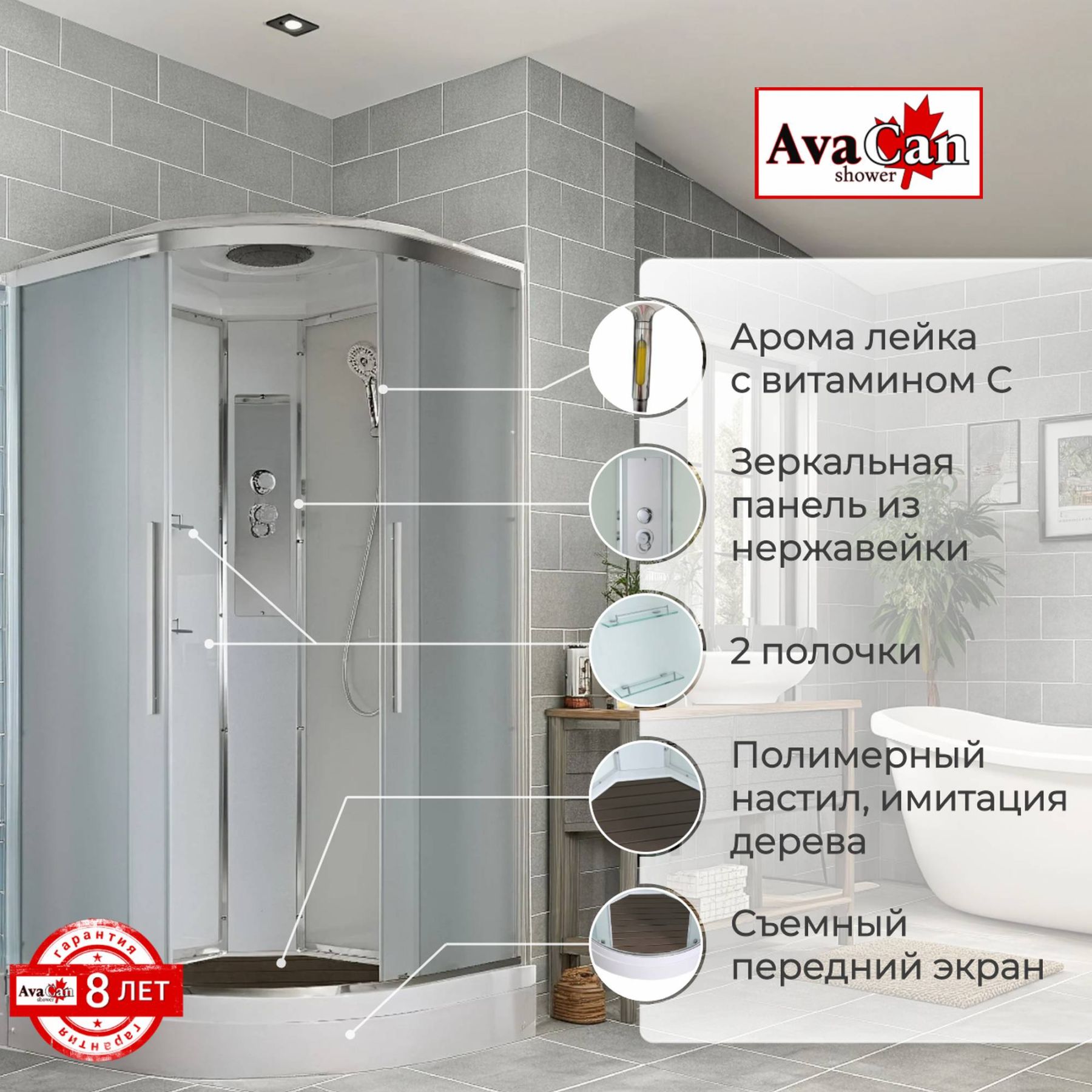 Стильная душевая кабина AvaCan EM2080 сочетает в себе высокую функциональность, практичность и надежность. При изготовлении применяется безопасное закаленное стекло толщиной 5 мм (матовое), надежно фиксируемое алюминиевым профилем. Сборка без силикона (увеличивает срок службы), внутренняя сборка(облегчает установку и ревизию; позволяет установить в ограниченном пространстве), смеситель резьбовой (без хомутов). Съемный экран поддона (позволяет осуществлять ревизию сифона). Цвет профиля хром. Двойные металлические ролики дверей (увеличивают срок службы).В комплекте : душевая штанга, две полочки , тропический (верхний) душ, арома-лейка с витамином С (картридж съемный),полимерная вставка в поддон(имитация дерева),сифон, ручки дверей из нержавейки , двойные ролики .