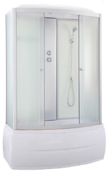 Внутри кабины усиленная полка 30 см с ограничителями. В кабине установлен однорычажный смеситель, верхний (тропический) душ, ручной душ, вентиляционные отверстия, слив – перелив, шланг длиной 65 см, "антизапах". Вся фурнитура хромированная.