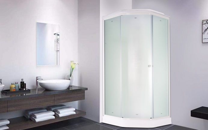 Закаленное стекло, 4 мм. Матовое полотно скрывает человека внутри кабины, снаружи можно рассмотреть только контуры тела. Закаленное стекло устойчиво к случайным ударам. В случае биться полотно рассыпается на множество граней с тупыми концами, о которые нельзя порезаться.