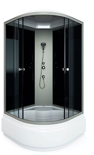 поддон высокий 45см фронтальные стекла: тонированные задние стекла : черные задняя панель: пластик серебро хромированный алюминиевый профиль регулируемые ролики хромированные ручки для дверей 2-режимный смеситель ручная лейка слив с сифоном крыша с верхней лейкой