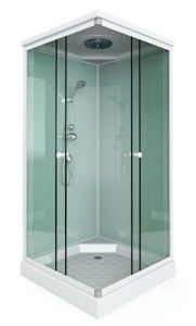 поддон низкий 15см (квадрат) фронтальные стекла : матовые фактурные задние стекла : белые матовые белый алюминиевый профиль регулируемые ролики белые ручки для дверей 2-режимный смеситель ручная лейка (на стенке ) слив с сифоном крыша с верхней лейкой