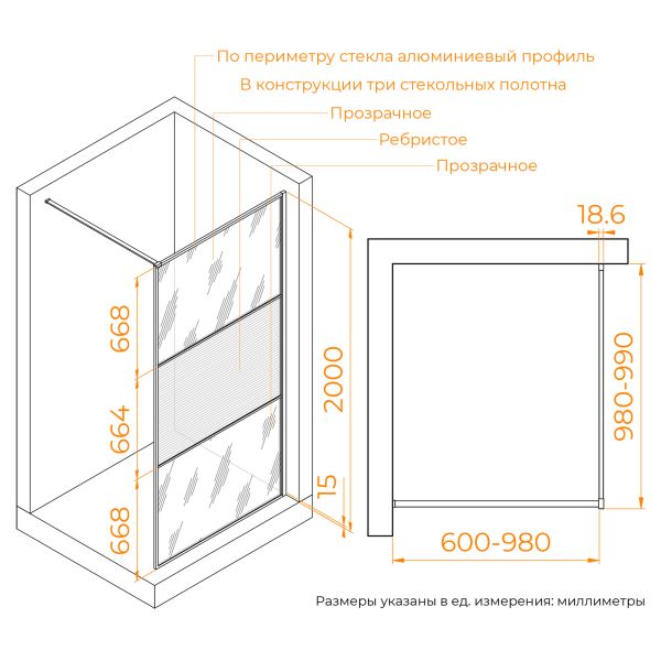 Главное преимущество данной модели — минимальная упаковка в виде чемоданчика с ручкой. Это позволяет легко и удобно транспортировать душевую перегородку!Душевая перегородка состоит из 3-х стекольных полотен (8мм), которые обрамлены изящным анодированным алюминиевым профилем!Штанга из стали S304, крепится к стене, она обеспечивает стабильность душевого ограждения. Длина стальной штанги 1000 мм, при этом ее всегда можно укоротить путем обычной подрезки.В конструктив модели возможно добавить тканевую водонепроницаемую шторку, при этом варианте использовать Штангу - кронштейна как карниз.Модели представлены в трендовых цветовых решениях профиля: