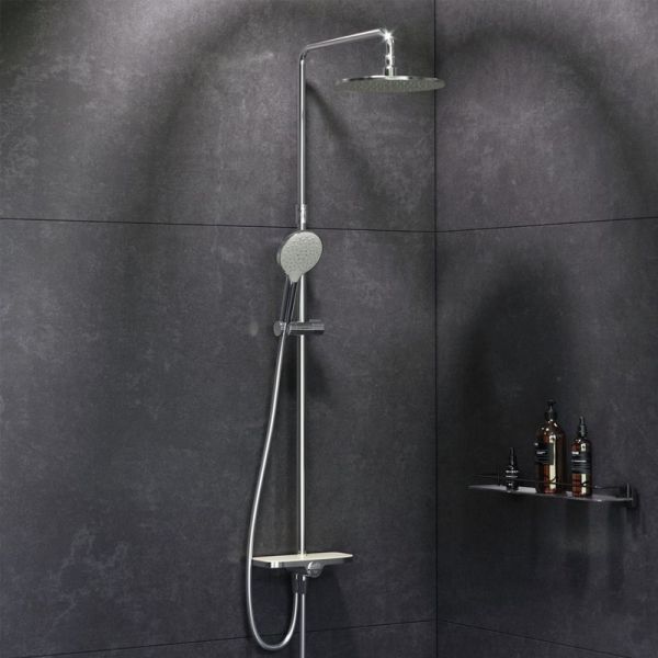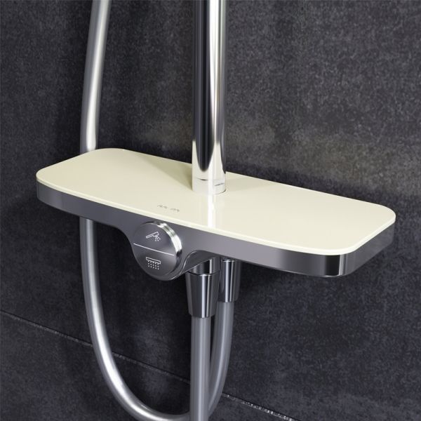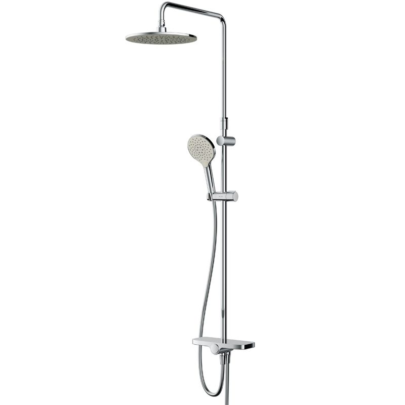 Тотальный дизайн в действии: все детали душевой системы – от пропорций ручного и верхнего душей до рисунка расположения форсунок на лейках.Премиальные размеры и продуманные детали: увеличенный диаметр душевых леек (верхний душ 254 мм и ручной душ 120 мм) позволит ощутить преимущества тропического душа, тогда как увеличенная длина шланга 1750 мм обеспечит свободу движений во время принятия душа. Телескопическая поворотная штанга регулируется по высоте в диапазоне от 1030 до 1460 мм, обеспечивая комфорт для людей любого роста, а шаровой шарнир в держателе верхнего душа позволяет регулировать угол его наклона.Нижнее крепление штанги выполнено в виде полочки, а переключатель верхний-ручной душ является ее продолжением. Нажав на него, вы можете менять источник потока воды от ручной лейки к верхнему душу.