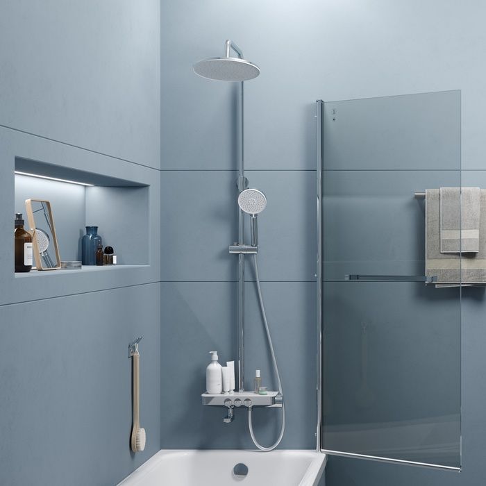 Хромированный смеситель для ванны с верхним душем Shelfy с дизайнерским корпусом с декоративными элементами из закаленного стекла и стильными белыми вставками. Технологичное и понятное кнопочное управление Push Control. Регулировка комфортной температуры воды производится поворотом ручки.