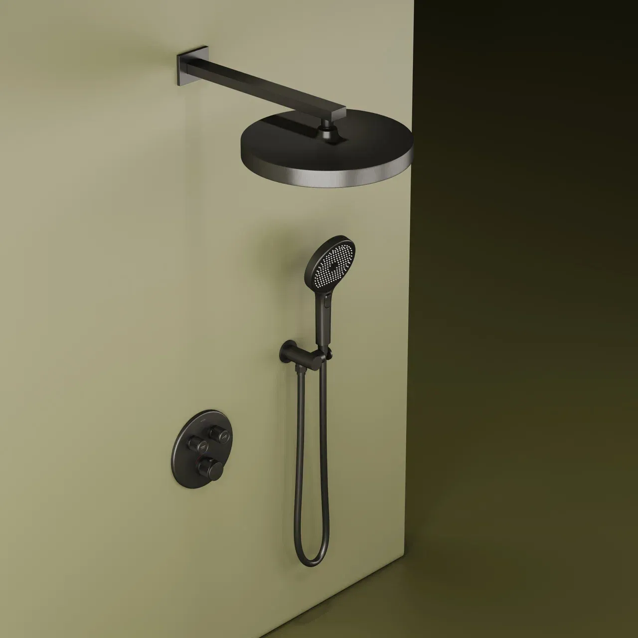 Душевой комплект SANCOS Space встраиваемый, c термостатическим смесителем, верхним, ручным душем и шлангом в комплекте, цвет вороненая сталь, арт. SC3006GMG