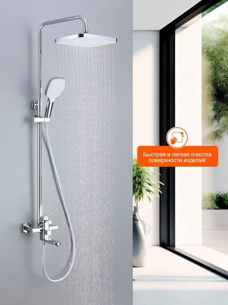 Верхний душ 320х210 мм регулируется по высоте благодаря телескопической штанге и по наклону с помощью встроенного шарнира, что обеспечивает максимальный комфорт и удобство использования. Самоочищающиеся силиконовые форсунки предотвращают образование известкового налета и сохраняют чистоту и силу потока воды.