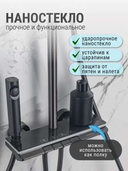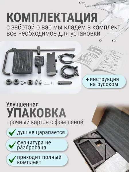 Душевой комплект содержит все необходимое для монтажа. Кроме того, наша душевая стойка с дисплеем и подсветкой имеет простой и быстрый монтаж, благодаря чему вы сможете установить ее самостоятельно без привлечения специалистов. Это позволит сэкономить время и деньги, а также получить удовольствие от процесса создания своего уютного уголка в ванной комнате.