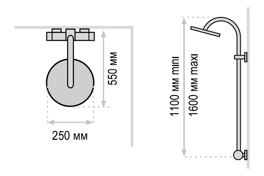 Верхний тропический душ D 250mm(ABS) -Ручной душ.Гибкий шланг 1.75 м. -Механический монокомандный смеситель со встроеным изливом -Душевая штанга (Латунь) регулируется по высоте -Пристенный вариант установки