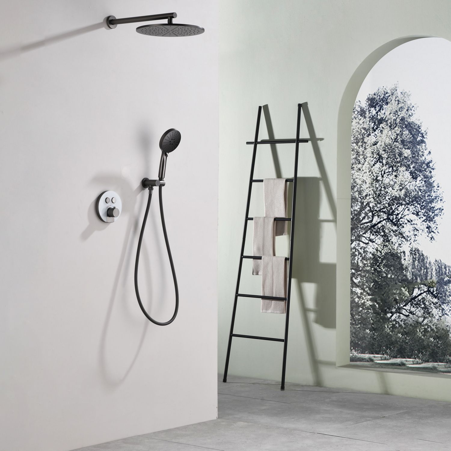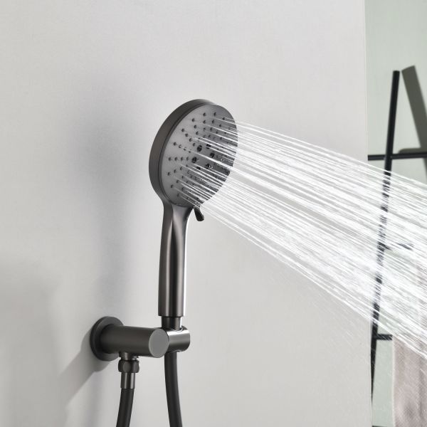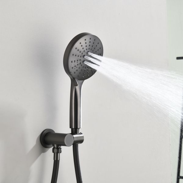 Комплект скрытого монтажа для душа датского производителя Black&White в цвете оружейная сталь. Корпус изделия выполнен в форме диска, в который интегрирован термостатический картридж прогрессивного типа для настройки температуры с постоянным давлением, а также кнопочный дивертор для выбора нужного потребителя. В комплектацию входит верхний душ на кронштейне цилиндрической формы и ручная лейка с режимами. Скрытая часть также входит в комплектацию данного изделия.