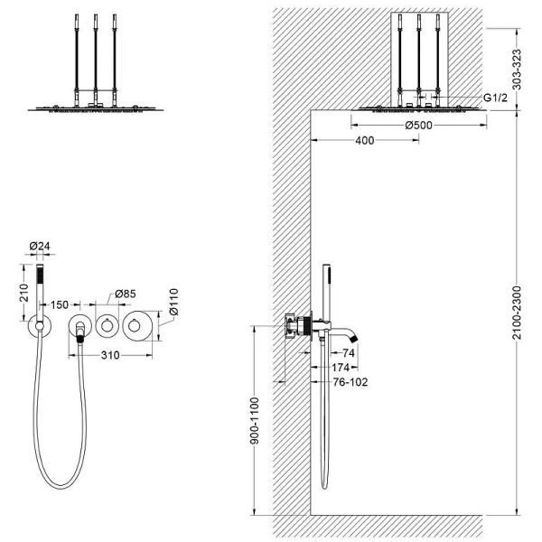 Душевая система встроенная с потолочным душем с круглой лейкой в стиле модерн