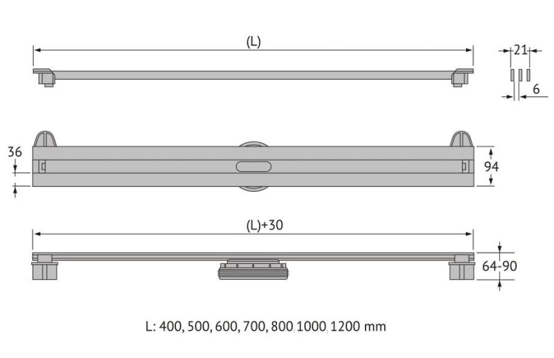 Решетка и декоративные заглушки, нержавеющая сталь AISI 304Комплект регулировки решетки по высоте от 8 до 30ммСетка для волос, пластикКомплект гидроизоляцииЖелоб водосток, нержавеющая сталь AISI 304Монтажная заглушка, пенопластРегулируемые по высоте ножки, пластикСамопромывной S-образный сифон PPВертикальный выпуск 48 л/мин , пропускная способность 42л/мин, монтаж 360°Монтажный ключ, пластик