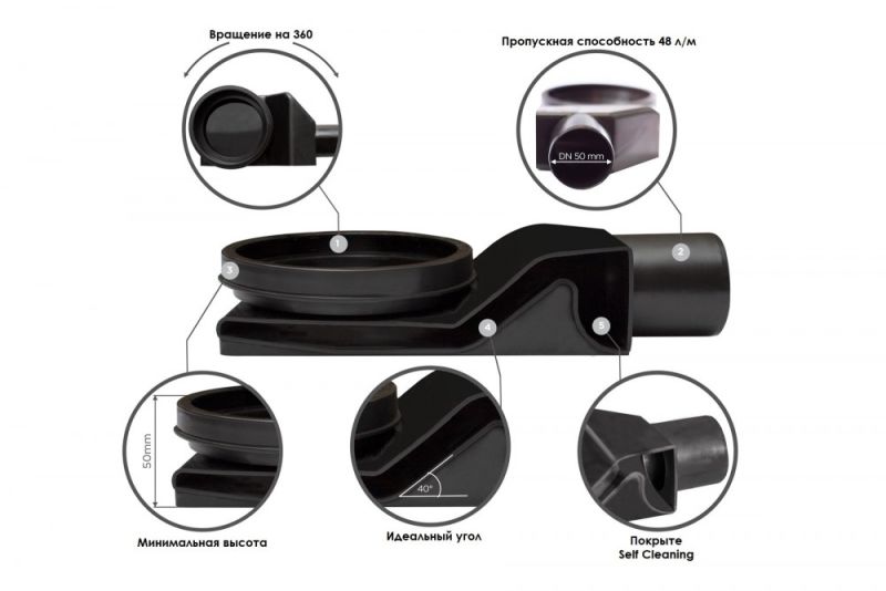 "Дизайн-вставка: металл перфорация (матовый хром). Рамка: металл "матовый хром" Минимальная высота монтажа 52 мм, выход ?50 мм, поворот базы 360 Пропускная способность 48 л/мин, комбинир. затвор (сухой и гидро). Материалы: дизайн-вставка - нерж. сталь AISI 304 SS; корпус - ABS; переходник, сифон - PP. "