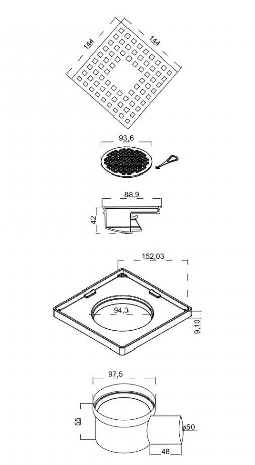 Решетка толщина 0,8 ммНержавеющая сталь AISI 304Горловина трапа пластикКомбинированный затворКорпус PP Горизонтальный выпуск D50Монтаж 360°