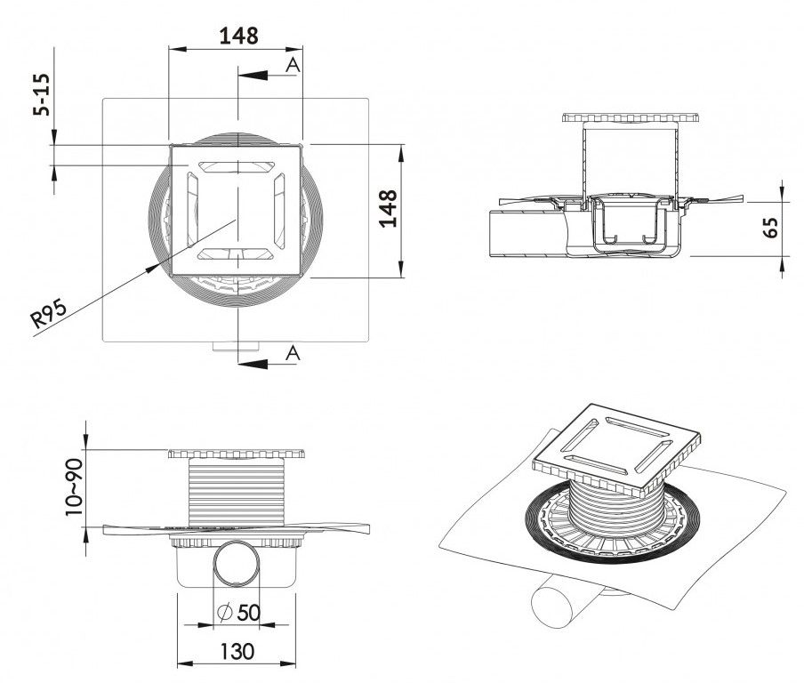 Решетка толщина 3 мм, нержавеющая сталь AISI 304Горловина трапа и эксцентрик, пластикМонтажная заглушка, PPСифон PP с гидроизоляциейГоризонтальный выпуск D50 H65, монтаж 360°Комбинированный затворФланец с 3 сторон загибается на 90°Монтажный ключ, пластик