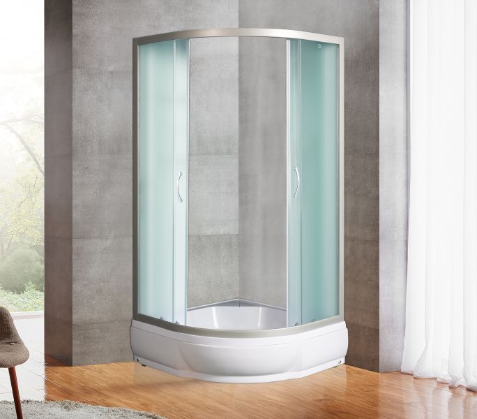 Типы и размеры:без поддона 100*100*185с поддоном 100*100*211 Матовое стекло, профиль матовый хромДушевое ограждение для ванной комнаты полукруглое с боковым регулировочным профилем и саморегулирующимися металическами, хромированными, двойными роликами.