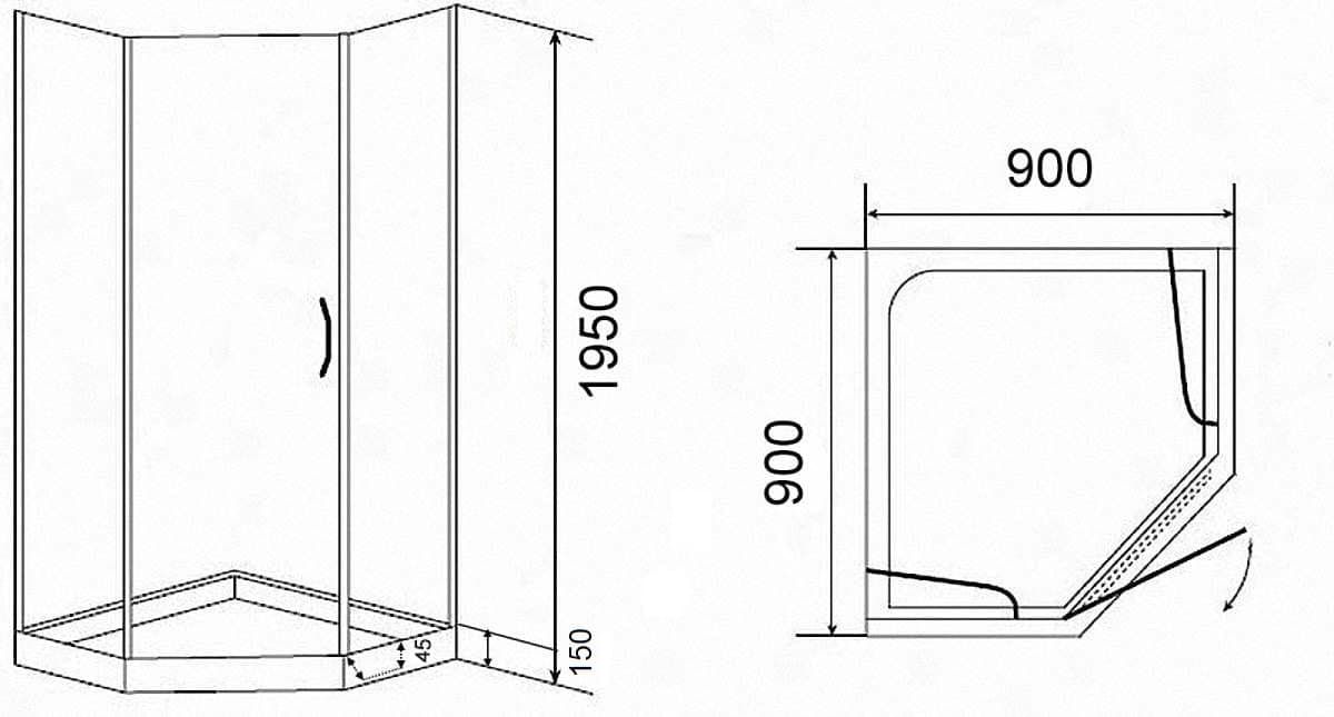 МОНТАЖ БЕЗ СИЛИКОНАУголок ZPE911T душевой PARLY с поддоном (90х90х195)Размер: 90х90х195 смСтильный уголок пятиугольной формы с распашной дверью. Прозрачное стекло и полированный профиль придают модели визуальную легкость. Уголок не утяжеляет пространство и хорошо дополняет любое оформление ванной комнаты.