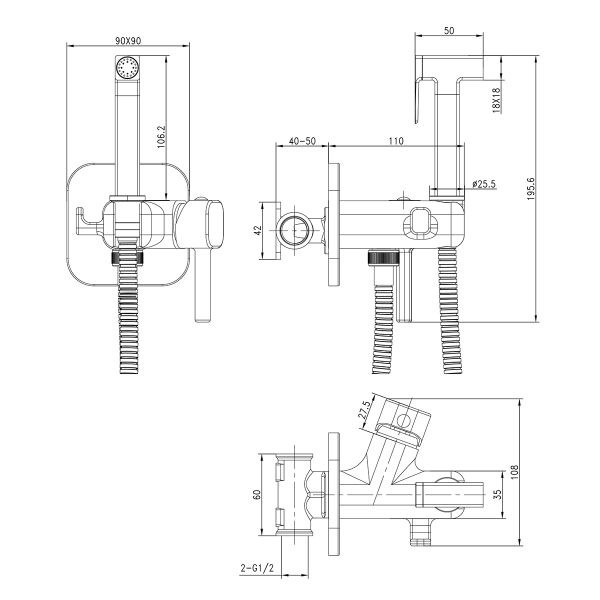 - Аксессуары в комплекте: лейка гигиенического душа с нажимным механизмом, душевой шланг 1,2 м (Turn-Free)