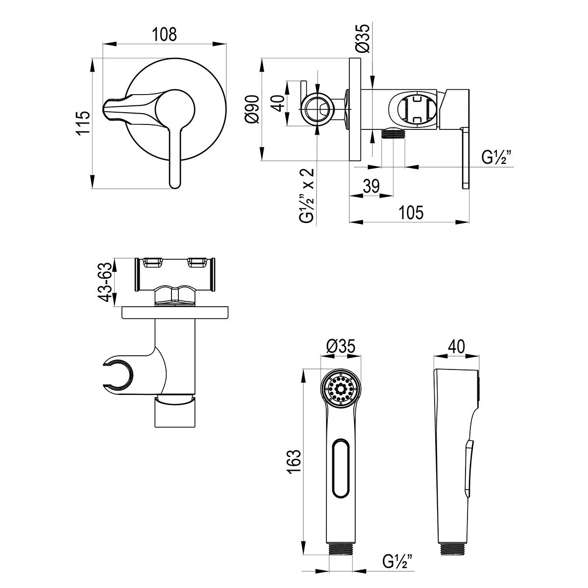 - Аксессуары в комплекте: лейка гигиенического душа с нажимным механизмом, душевой шланг 1,2 м