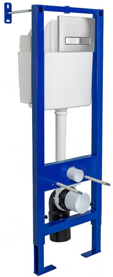 Узкая рама шириной 41 см.Металлический каркас, окрашенный антикоррозийной эмалью.Расчетная нагрузка 400кг. Объём резервуара воды 10 л с тепло- и шумоизоляцией.Подвод воды внутрь резервуара (G1/2 наружная).Объем смыва 3/6 литра с возможностью регулировки.Управление механическое, две кнопки.Межосевое расстояние под шпильки для подвеса унитаза 18 и 23 см. Полный комплект для установки включает в себяшумоизоляционную прокладку и лекало для монтажных отверстий.