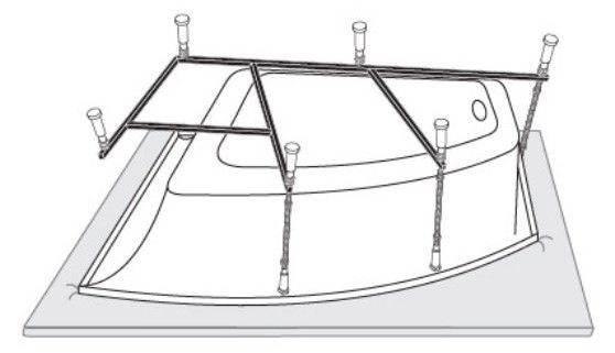 Усиленный цельносварной стальной каркас для ванны изготовлен из квадратного металлического профиля 2х2 см и окрашен темно-бронзовой молотковой краской. Каркас имеет 8 ножек и 4 опоры в борт ванны снизу. Предназначен для использования во влажных помещениях.