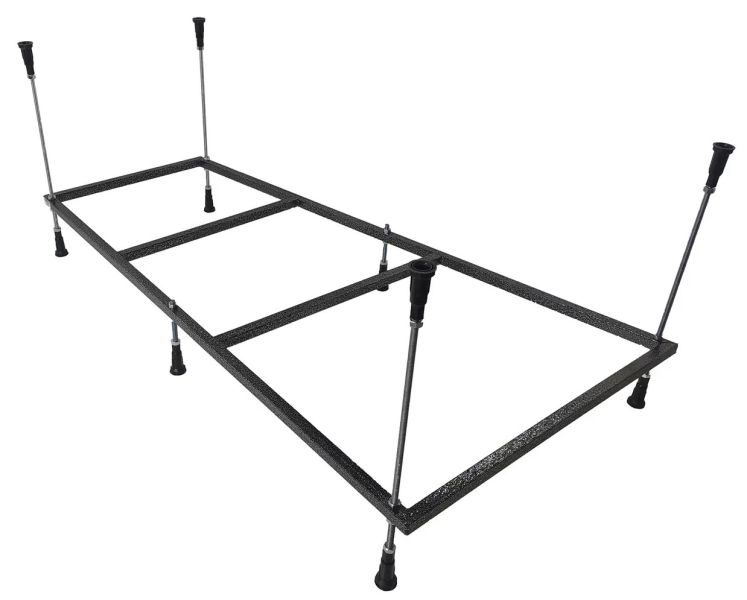Усиленный цельносварной стальной каркас для ванны изготовлен из квадратного металлического профиля 2х2 см и окрашен темно-бронзовой молотковой краской. Каркас имеет 8 ножек и 4 опоры в борт ванны снизу. Предназначен для использования во влажных помещениях.