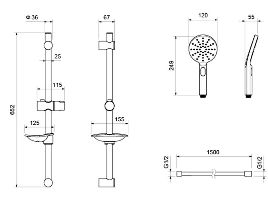• Душевой гарнитур: душевая стойка с мыльницей, лейка, шланг