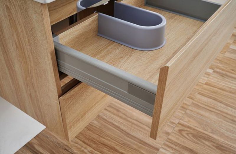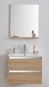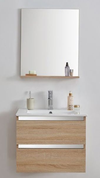 1. Многослойное дерево, 2. Два выдвижных ящика с доводчиками 3. Цвет: светлый дуб. 4. Зеркало с полкой. 5.Раковина в комплекте.