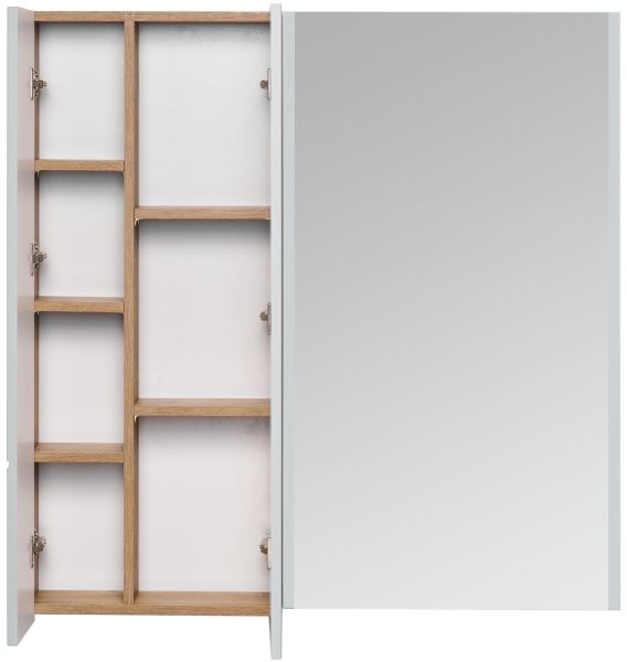 - Открывается модуль за фасад. Внутреннее пространство шкафчика поделено на ассиметричные секции, что позволяет разместить косметические различные косметические средства