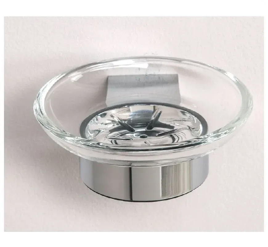 Мыльница для ванной комнаты Aquanet 5685 из прозрачного стекла круглой формы имеет очень простое с одной стороны и вместе с тем оригинальное дизайнерское решение. Предусмотренное для нее массивное крепление к стене перетекает в широкое кольцо, в котором надежно установлена прозрачная емкость для мыла словно маленькая тарелочка. Такой вариант мыльниц, когда стекло устанавливается на подставке из металла, покрытого хромом, считается самым надежным. Они изящно смотрятся, легко моются, ими удобно пользоваться.