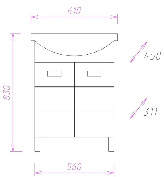 Размеры тумбы без учета раковины и ножек: 56x31x68 см.