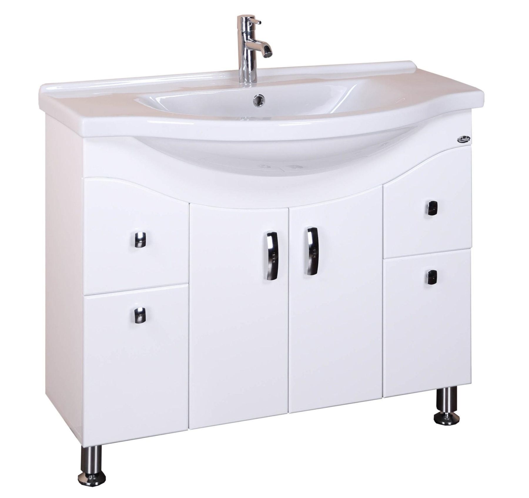 В тумбе Onika Эльбрус 90 белоснежный глянец фасада подчеркивается оригинальной хромированной фурнитурой и сложной изысканной геометрией линий.