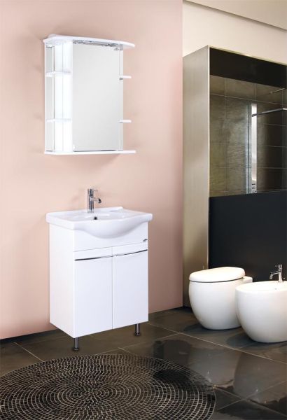 Одно большое отделение с двумя распашными дверцами, оснащенными системой плавного закрывания, пространство внутри которого разделено полкой, позволит вместить все необходимые в ванной мелочи.