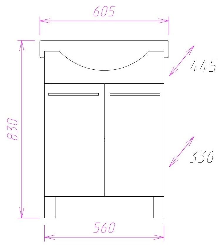 Размеры тумбы без учета раковины и ножек 56x34x68 cм.