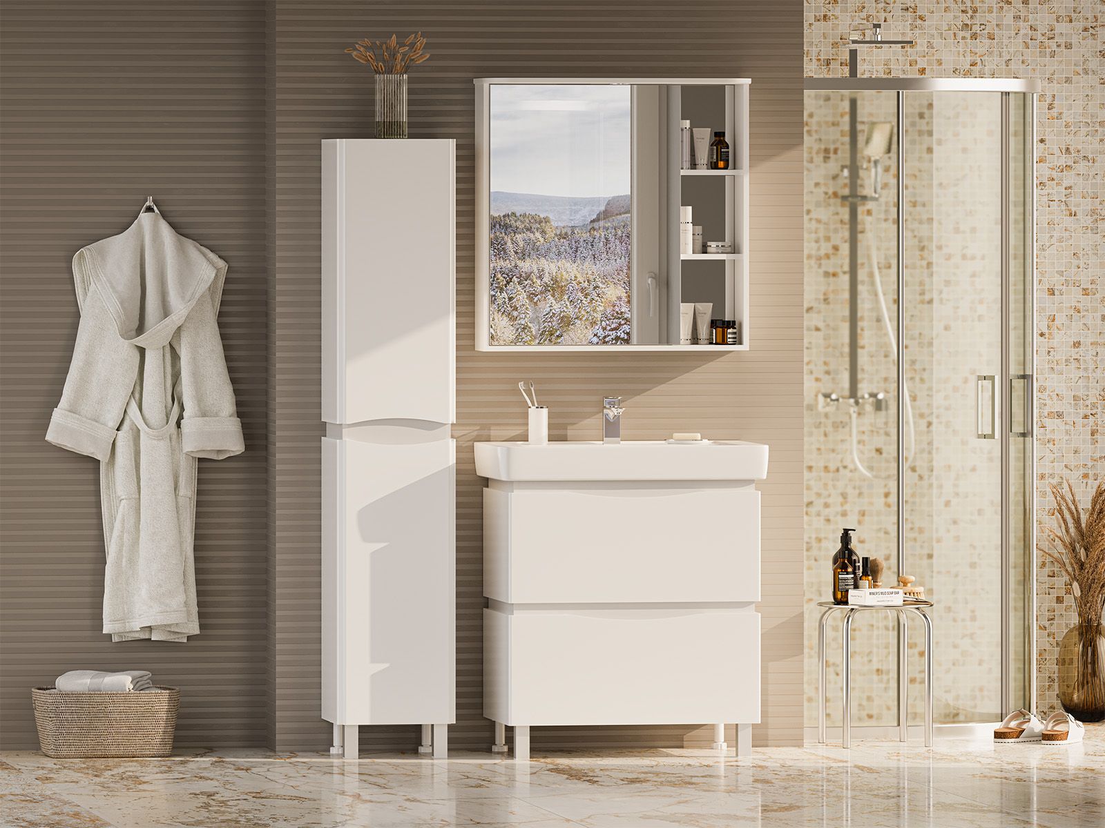 Шкаф-пенал для ванной комнаты – это стильное решение, которое гармонично вписывается в современный интерьер. Его элегантные линии и аккуратные формы создают атмосферу чистоты и порядка, что особенно важно в таком интимном пространстве. Изготовленный из качественных влагостойких материалов, этот шкаф обеспечивает долговечность и надежность, даже в условиях повышенной влажности.Основное преимущество шкаф-пенала заключается в его вместительности. Удобные полки и ящики позволяют организовать пространство и разместить все необходимое: от косметики до бытовых принадлежностей. Каждая деталь продумана для удобства использования, что делает утренние и вечерние ритуалы более приятными.Будь то строгий минимализм или уютный скандинавский стиль, шкаф-пенал станет акцентом, который подчеркивает индивидуальность вашего пространства. Не упустите возможность преобразить свою ванную комнату, добавив в нее этот элегантный и практичный элемент.