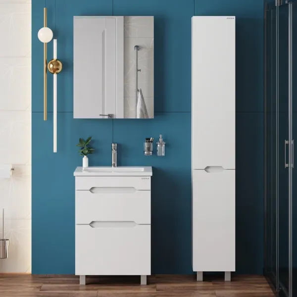 Пенал имеет два отделения за распашными дверцами с доводчиками, полки внутри регулируются по высоте. Ручки, изящно интегрированные в фасады, позволяют сделать эксплуатацию мебели более удобной и практичной.
