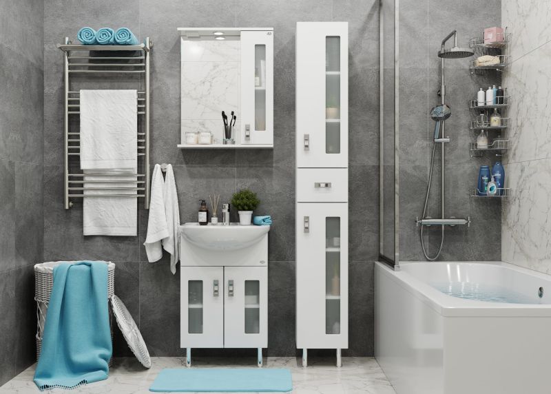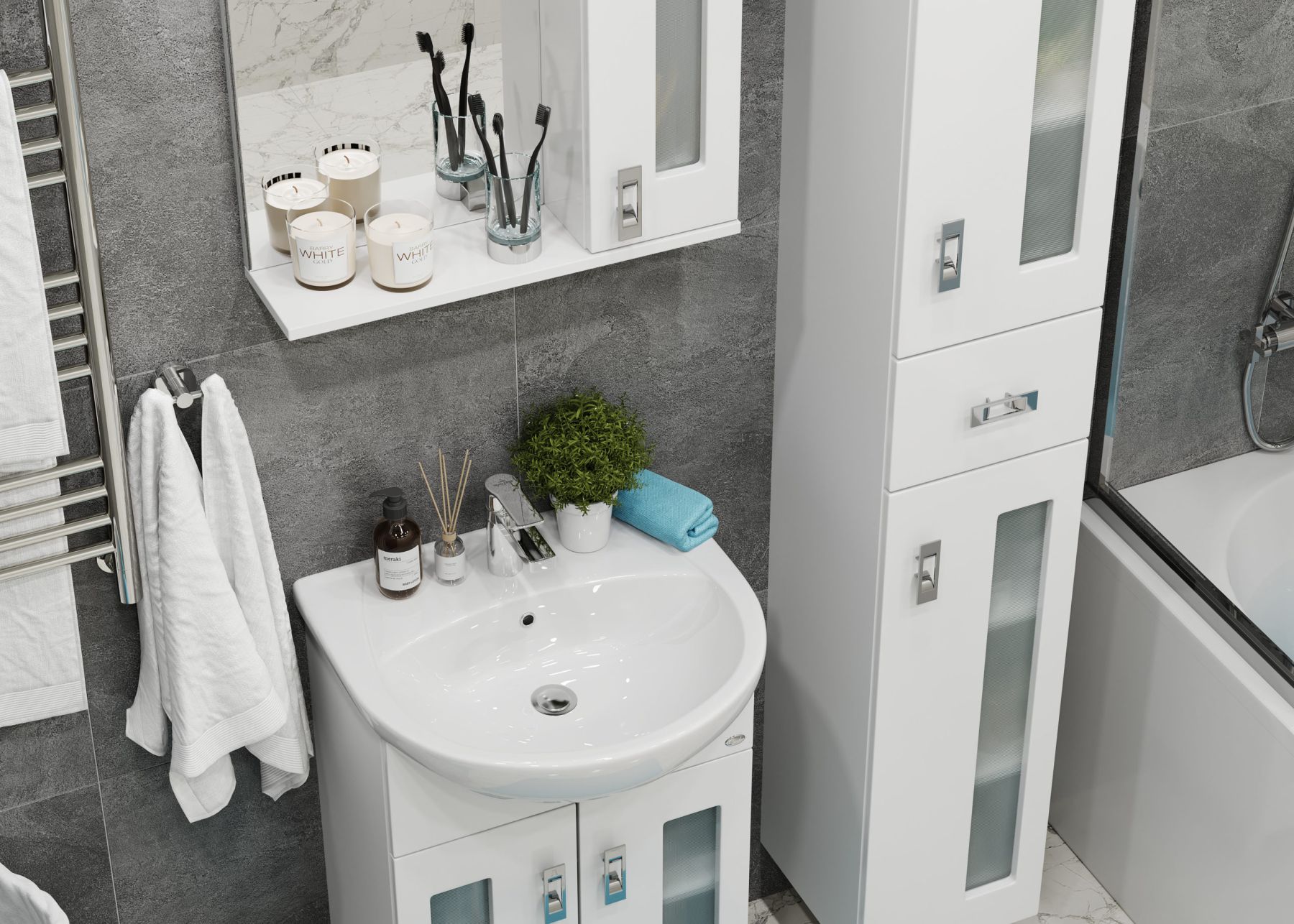 Глянцевый белый цвет фасада в сочетании со вставками из матового стекла придадут ванной комнате ощущение свежести, чистоты и уюта.