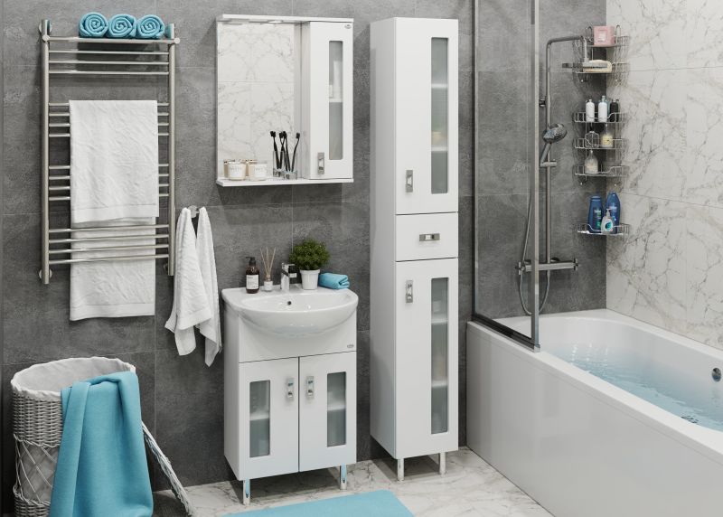 Корпус пенала выполнен из ЛДСП, фасад - из МДФ в пленке, специально предназначенных для использования в условиях высокой влажности.