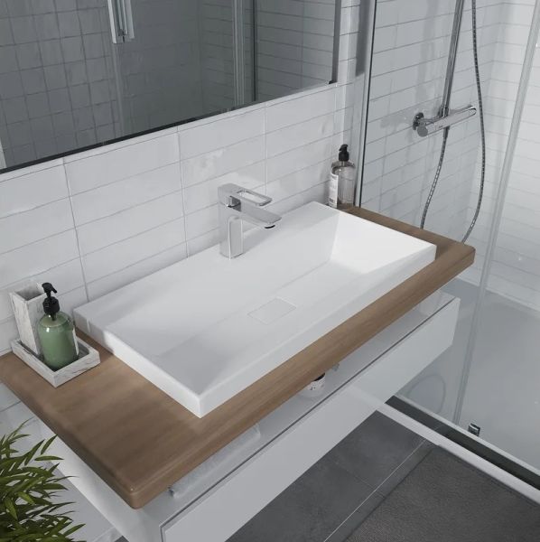 Раковина встраивается на мебель, в столешницу и на подстолье. Верхний слой представляет собой декоративно-защитное покрытие - импортный сантехнический гелькоут. Донный клапан отсутствует. В комплектацию входит декоративная накладка на слив.