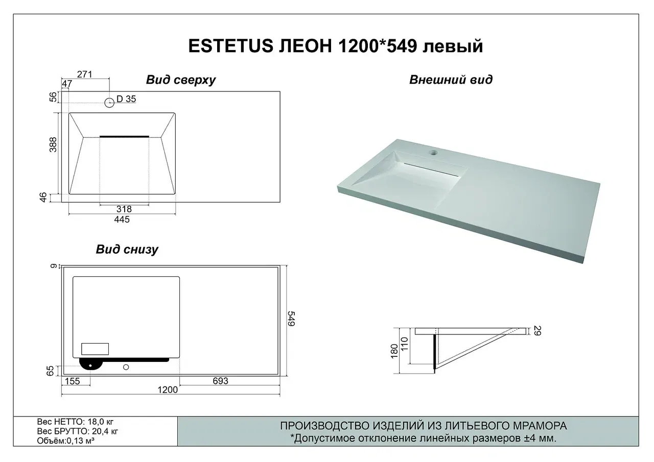 Раковина для мебели Style Line Estetus ЛЕОН 1200*549 со столешницей, материал искусственный камень.Расположение столешницы - справа.Слив-перелив и донный клапан приобретаются отдельно