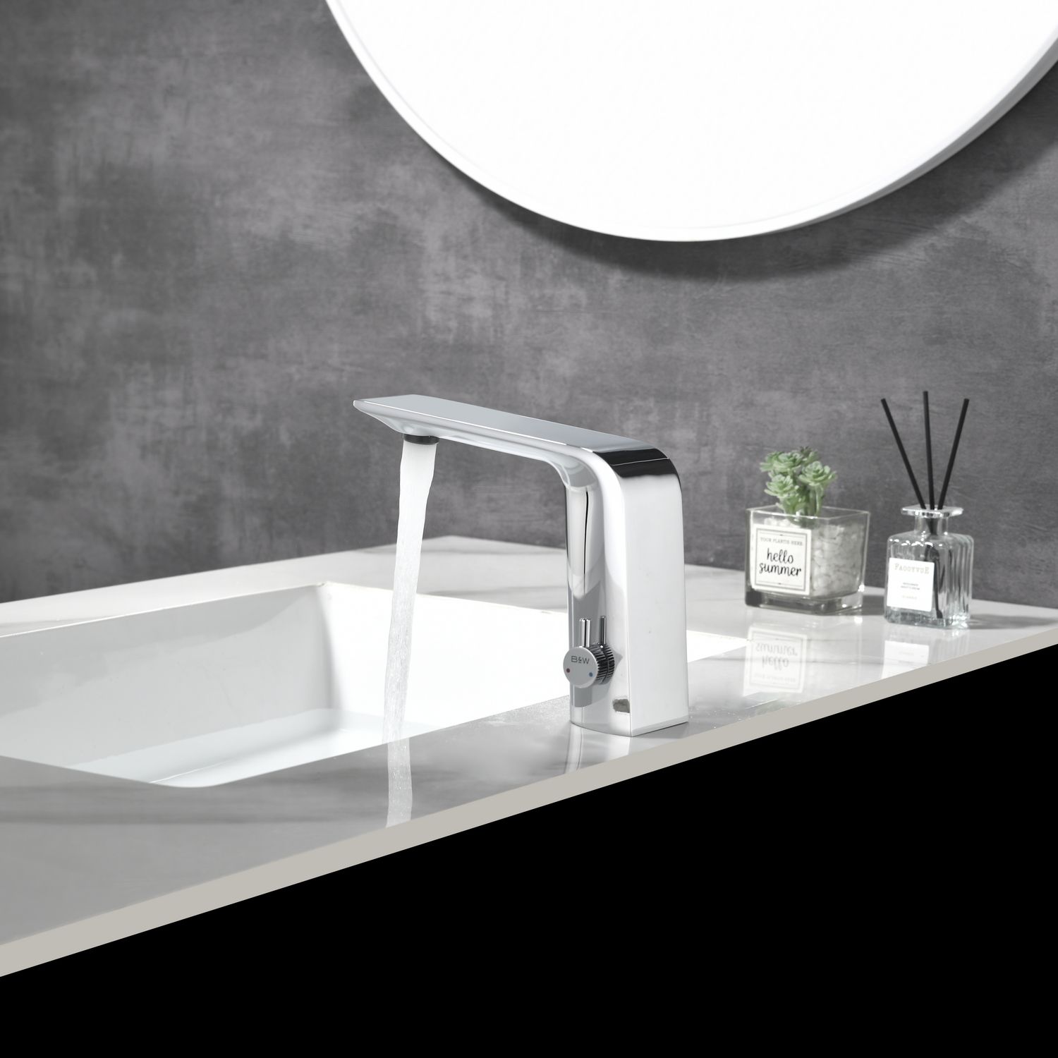 Смеситель для раковины датского производителя Black&White. Изделие изготовлено из сантехнической латуни – данный материал безопасен для здоровья и выдерживает высокое давление. Сверху корпус покрыт хромоникелевым покрытием, которое не корродирует. Открытие воды происходит с помощью инфракрасного датчика, который работает на аккумуляторе постоянного тока. Данное решение гигиенично и экономит воду, особенно в общественных помещениях. Настройка температуры вынесена на ручку расположенную справа от снования. Комбинация округлого основания и плоского излива гармонично вольется в современные интерьеры ванной комнаты.