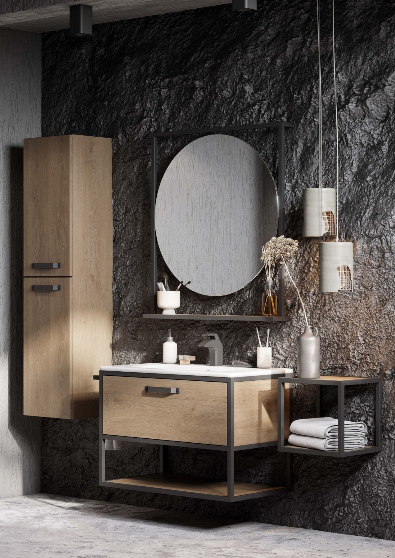 - Шкафчик может быть дополнен открытой навесной полкой в форме куба из коллекции Лофт Фабрик