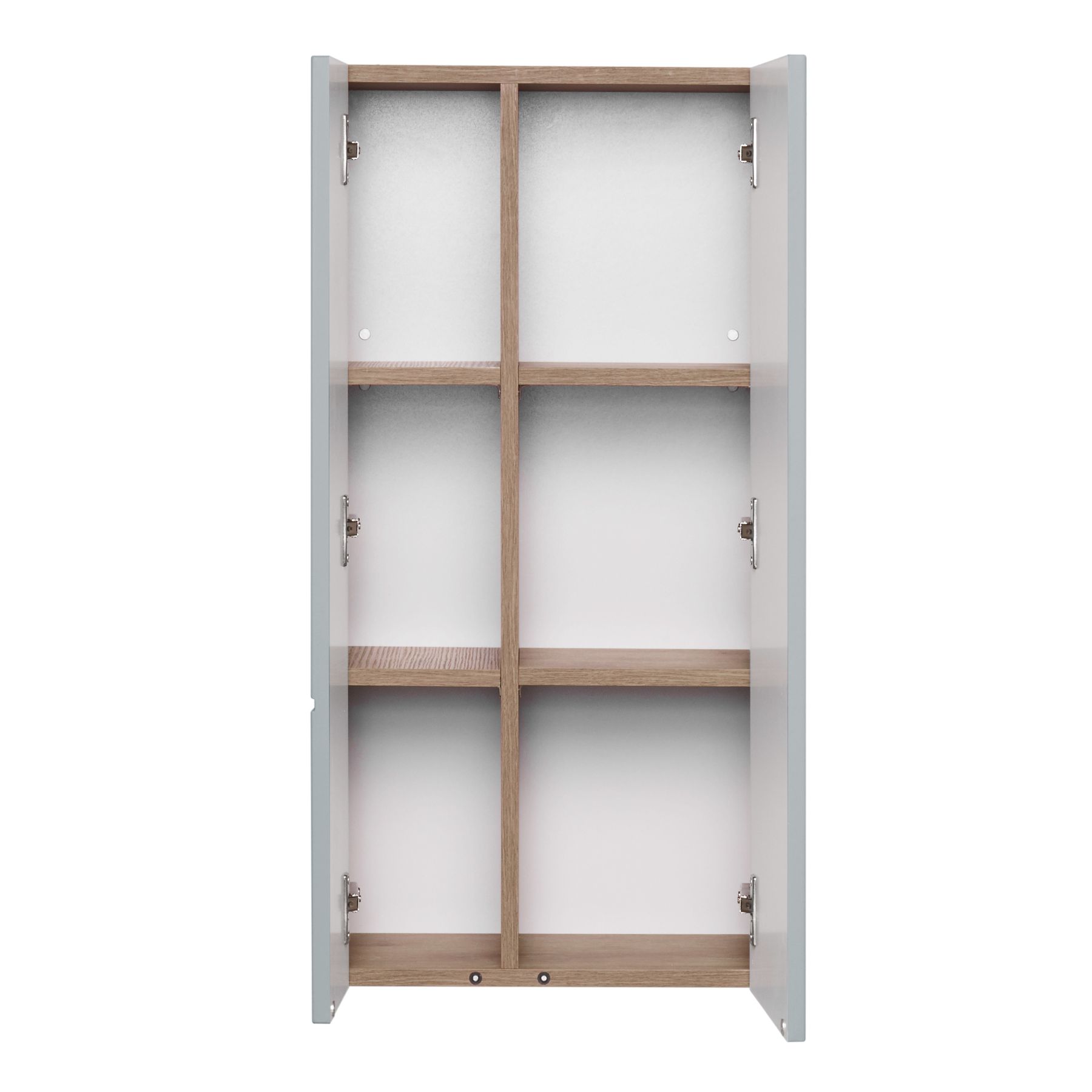 - Дизайн шкафчика повторяет тумбу-умывальник: фасады в матовой пленке фьерд сочетаются с корпусом в декоре дуб рустикальный