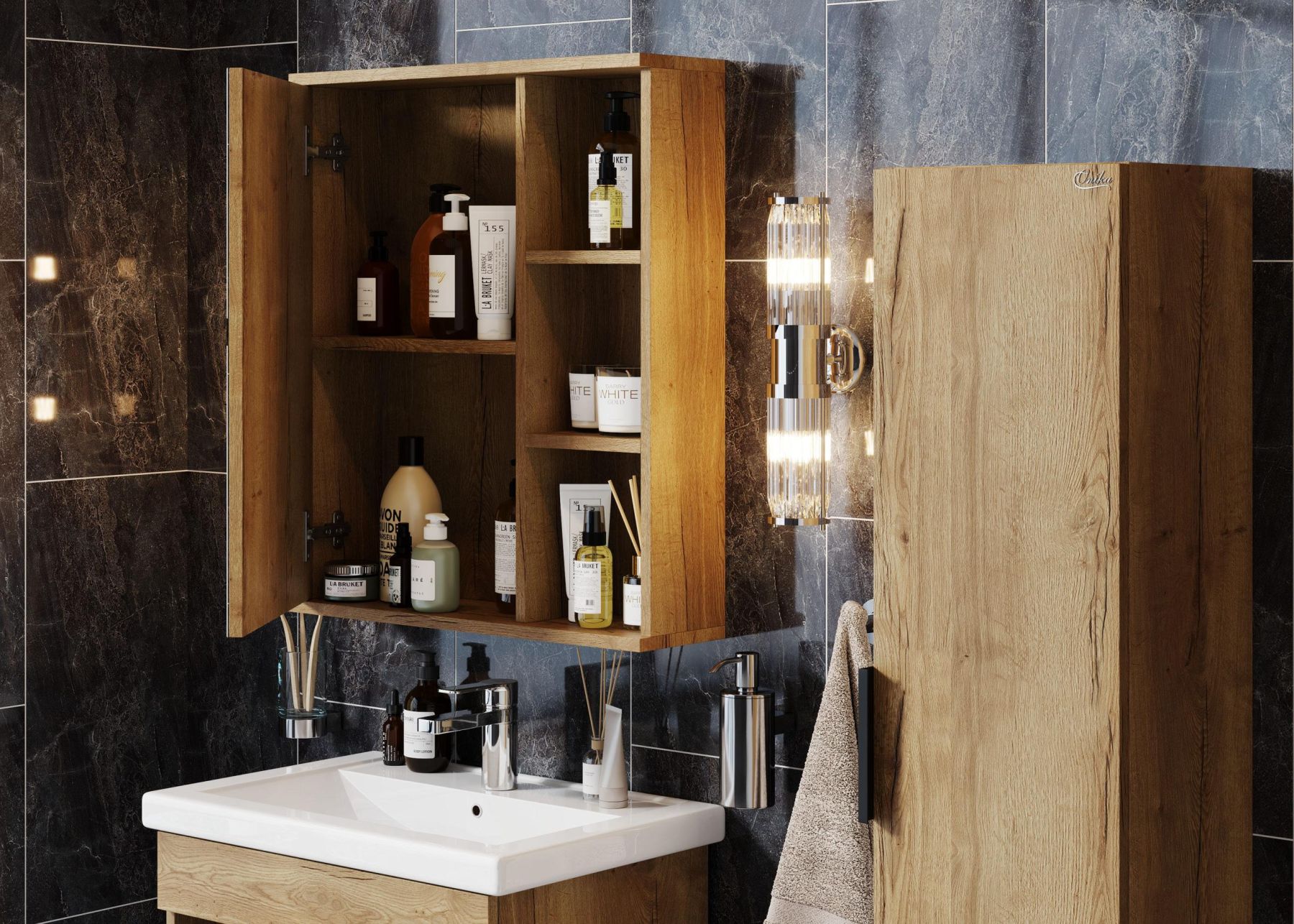 Роскошная текстура и натуральный цвет дуба подарят помещению дыхание природы и привнесет в ванную комнату ощущение гармонии.