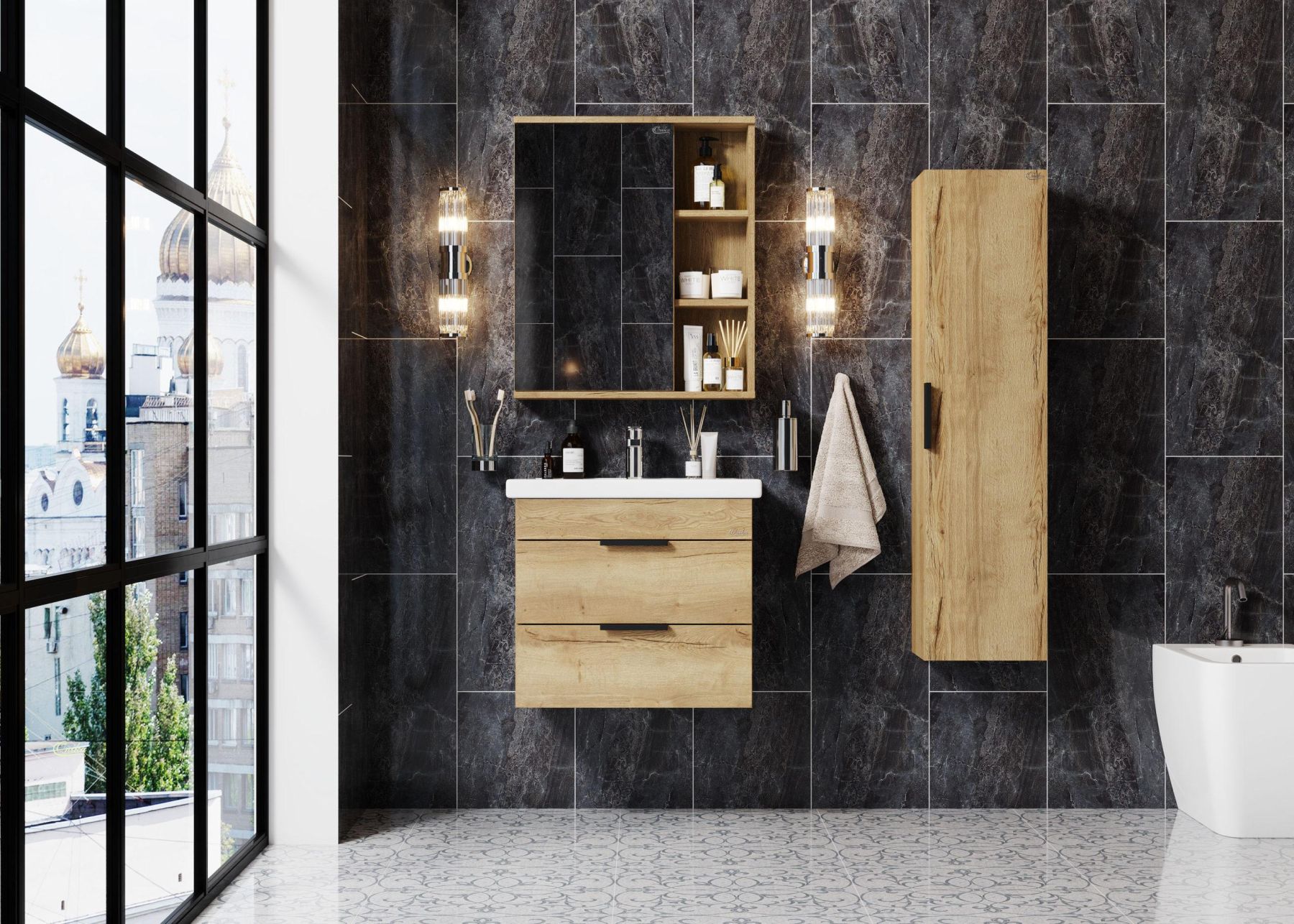 Роскошная текстура и натуральный цвет дуба подарят помещению дыхание природы и привнесет в ванную комнату ощущение гармонии.