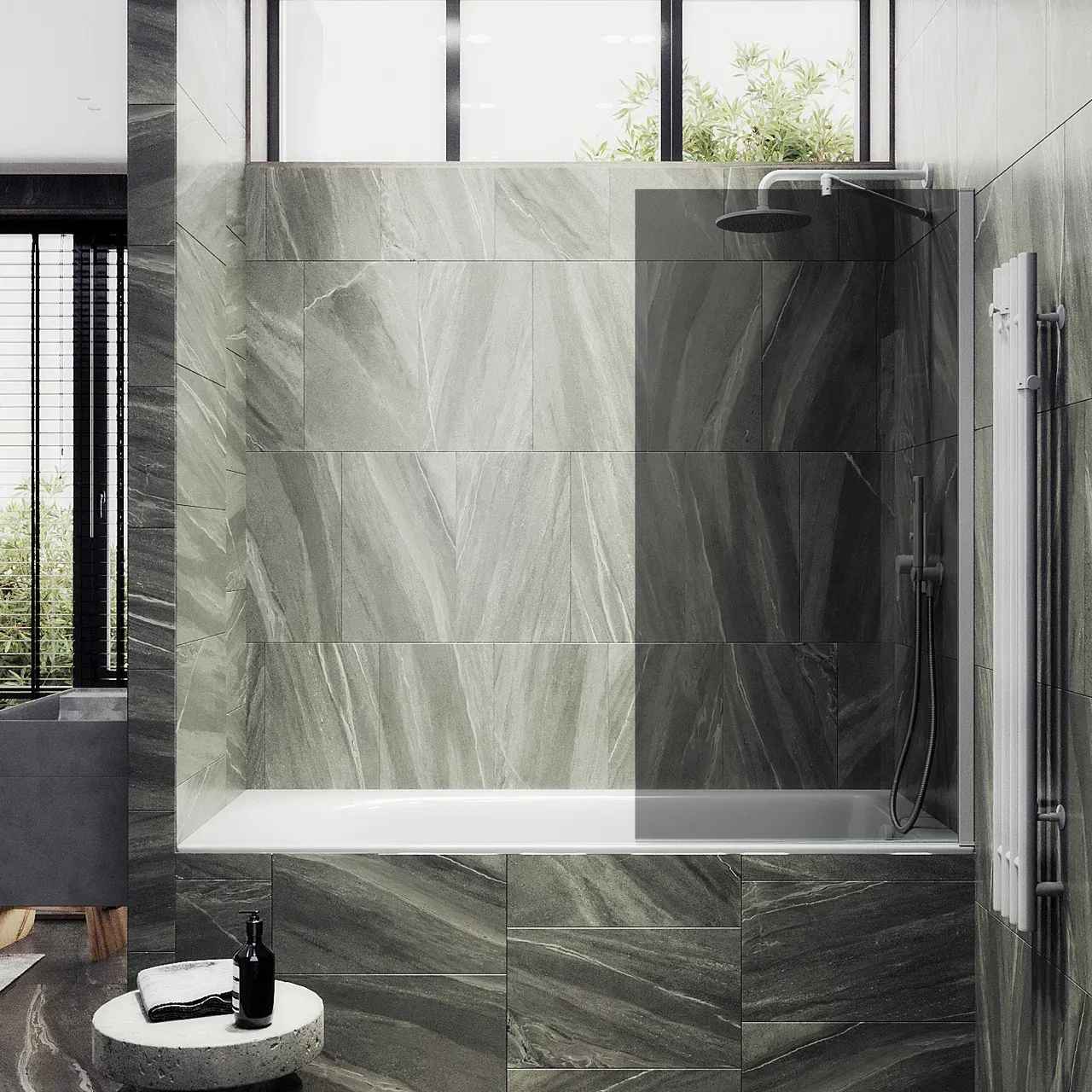 Монтаж осуществляется с помощью алюминиевого профиля, что обеспечивает надежность крепления и безопасность использования стеклянной перегородки для ванной. Также, шторка оснащена специальным уплотнителем, который предотвращает попадание воды на пол ванной комнаты. Закаленное стекло, цвет Графит, толщина 8 мм 1400х300 мм - 1 шт.